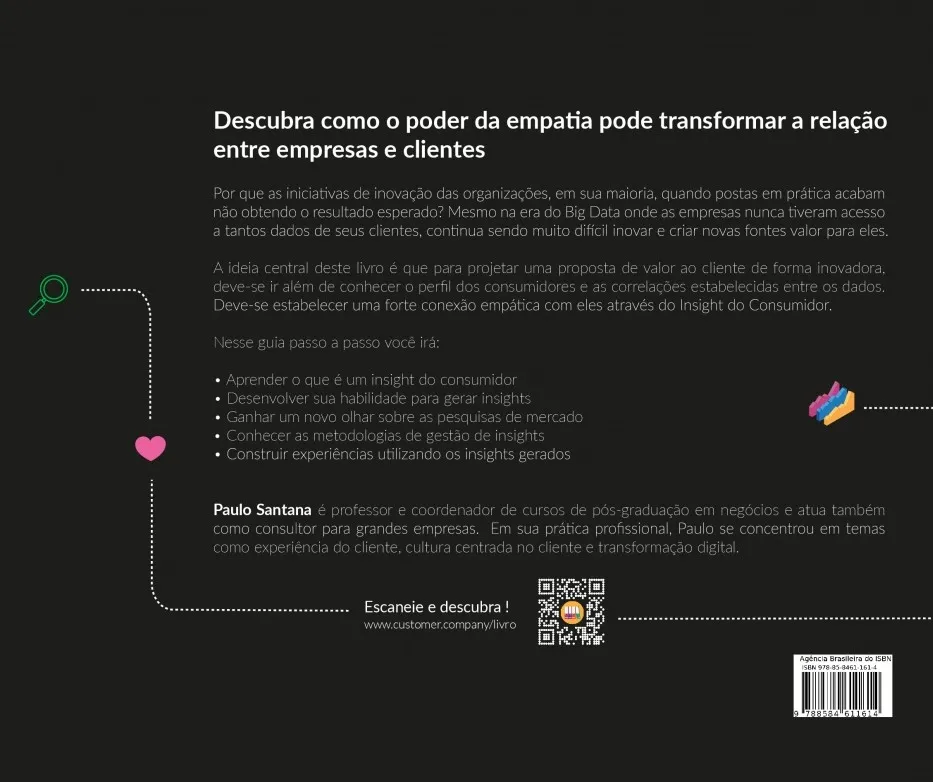 A ideia central deste livro é que para projetar uma proposta de valor ao cliente de forma inovadora, deve-se ir além de conhecer o perfil dos consumidores e as correlações estabelecidas entre os dados. Deve-se estabelecer uma forte conexão empática com eles através do Insight do Consumidor.