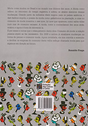 “Muita coisa mudou no Brasil e no mundo nos últimos dez anos. A Moda como reflexo do retrovisor do tempo registrou e sofreu os abalos sísmicos dessas mudanças. Grande parte da indústria têxtil migrou para os países asiáticos, o fast-fashion engoliu a poesia da moda como gafanhotos na plantação, a crise no consumo de moda inventou o see now, by now que apareceu como salva-vidas num mar de consumo escasso. A moda, como a conhecíamos dez anos atrás, acabou e agora é hora de reinventá-la. É por essas e outras que o relançamento desta obra Consumo de moda: a relação pessoa-objeto se faz necessário. Em 2008 a autora já sinalizava mudanças na forma de pensar e consumir moda. Agora revisitada, ela nos convida a entender e decifrar os enigmas do consumo desta velha esfinge chamada moda para que sigamos em direção ao futuro.” Ronaldo Fraga