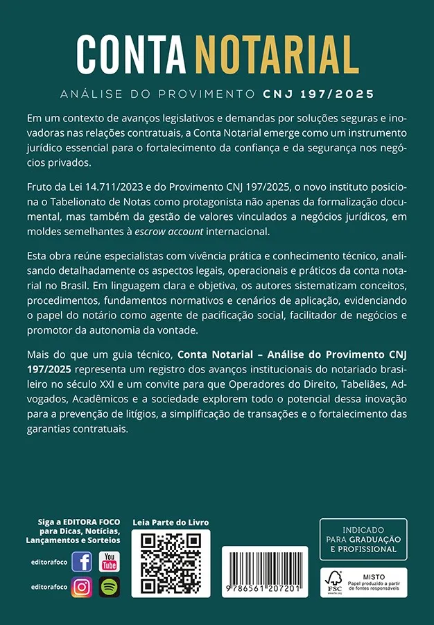 Mais do que um guia técnico, “Conta Notarial – Análise do Provimento CNJ 197/2025” representa um registro dos avanços institucionais do notariado brasileiro no século XXI e um convite para que operadores do Direito, tabeliães, advogados, acadêmicos e a sociedade explorem todo o potencial dessa inovação para a prevenção de litígios, a simplificação de transações e o fortalecimento das garantias contratuais.