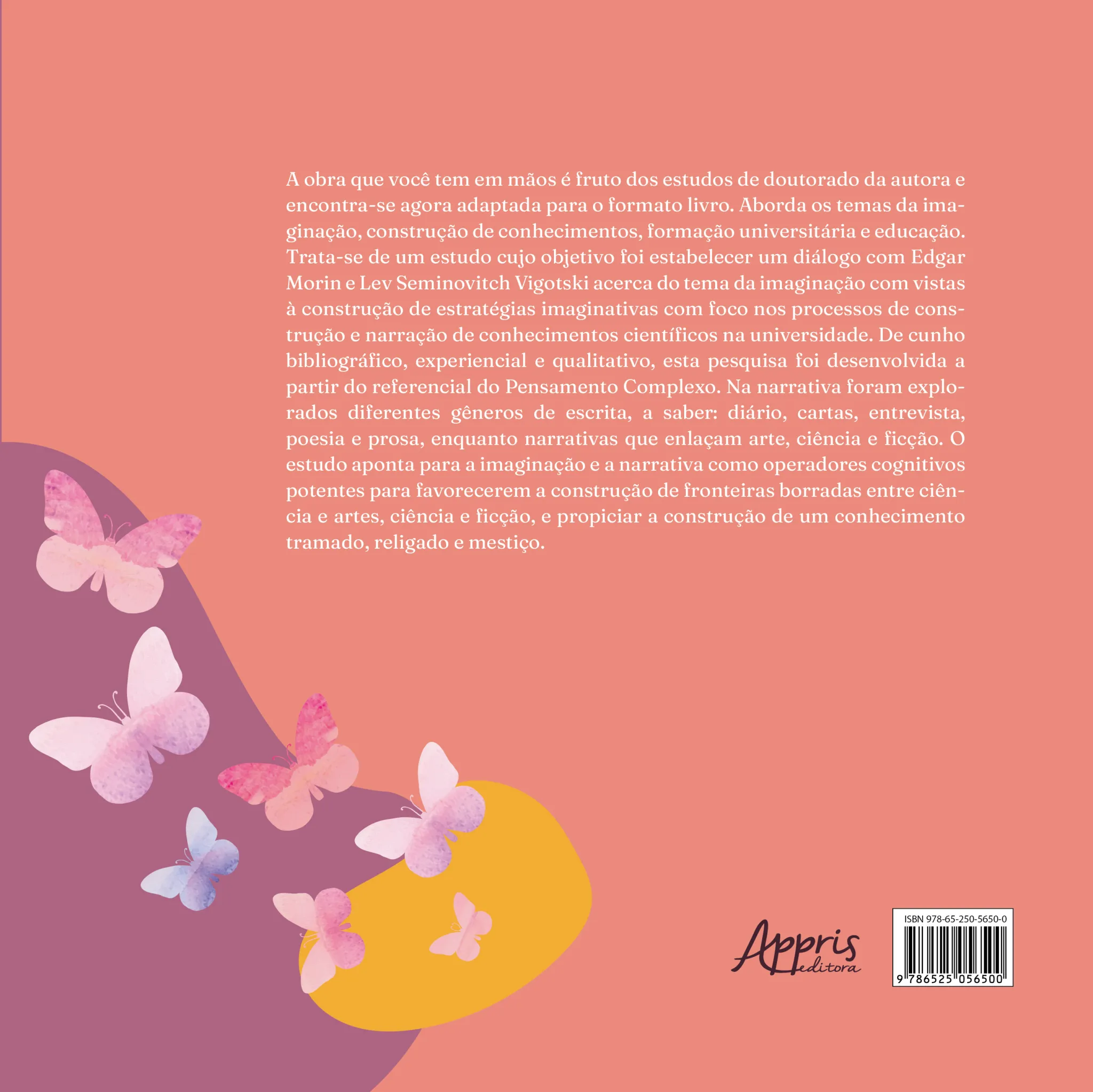 A obra que você tem em mãos é fruto dos estudos de doutorado da autora e encontra-se agora adaptada para o formato livro. Aborda os temas da imaginação, construção de conhecimentos, formação universitária e educação. Trata-se de um estudo cujo objetivo foi estabelecer um diálogo com Edgar Morin e Lev Seminovitch Vigotski acerca do tema da imaginação com vistas à construção de estratégias imaginativas com foco nos processos de construção e narração de conhecimentos científicos na universidade. De cunho bibliográfico, experiencial e qualitativo, esta pesquisa foi desenvolvida a partir do referencial do Pensamento Complexo. Na narrativa foram explorados diferentes gêneros de escrita, a saber: diário, cartas, entrevista, poesia e prosa, enquanto narrativas que enlaçam arte, ciência e ficção. O estudo aponta para a imaginação e a narrativa como operadores cognitivos potentes para favorecerem a construção de fronteiras borradas entre ciência e artes, ciência e ficção, e propiciar a construção de um conhecimento tramado, religado e mestiço.