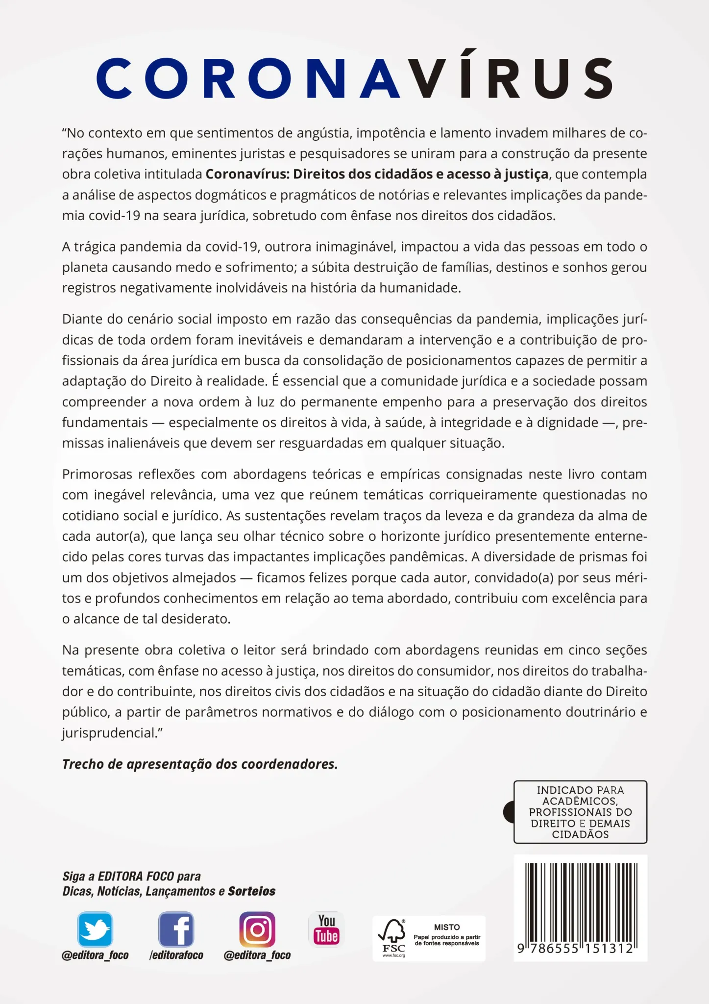No contexto em que sentimentos de angústia, impotência e lamento invadem milhares de corações humanos, eminentes juristas e pesquisadores se uniram para a construção da presente obra coletiva intitulada “Coronavírus: direitos dos cidadãos e acesso à justiça”, que contempla a análise de aspectos dogmáticos e pragmáticos de notórias e relevantes implicações da pandemia covid-19 na seara jurídica, sobretudo com ênfase nos direitos dos cidadãos.
