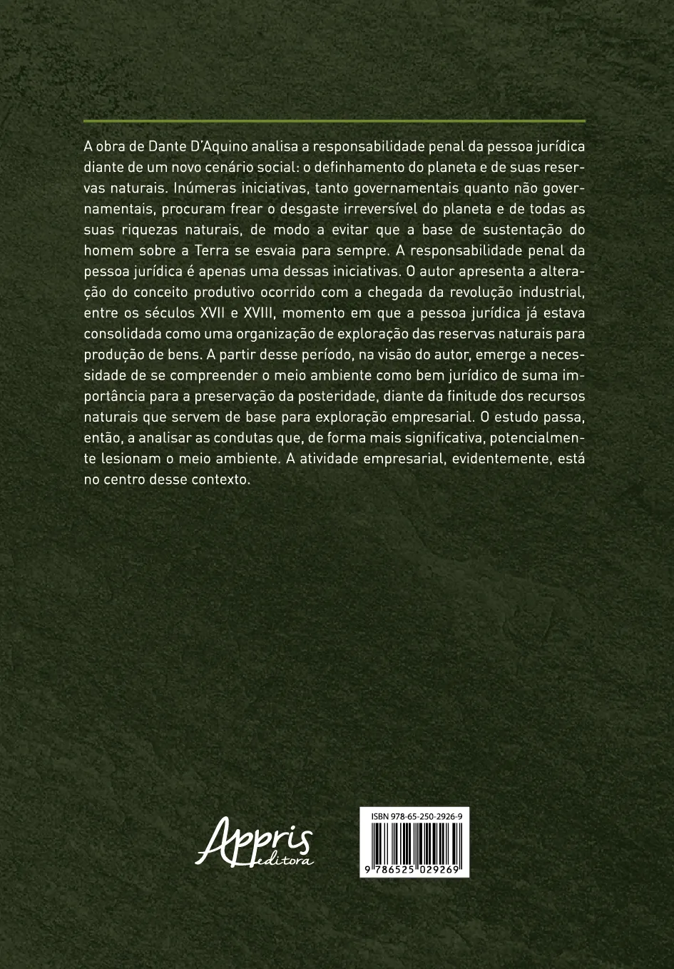 A obra de Dante D’Aquino analisa a responsabilidade penal da pessoa jurídica diante de um novo cenário social: o definhamento do planeta e de suas reservas naturais. Inúmeras iniciativas, tanto governamentais quanto não governamentais, procuram frear o desgaste irreversível do planeta e de todas as suas riquezas naturais, de modo a evitar que a base de sustentação do homem sobre a Terra se esvaia para sempre. A responsabilidade penal da pessoa jurídica é apenas uma dessas iniciativas. O autor apresenta a alteração do conceito produtivo ocorrido com a chegada da revolução industrial, entre os séculos XVII e XVIII, momento em que a pessoa jurídica já estava consolidada como uma organização de exploração das reservas naturais para produção de bens. A partir desse período, na visão do autor, emerge a necessidade de se compreender o meio ambiente como bem jurídico de suma importância para a preservação da posteridade, diante da finitude dos recursos naturais que servem de base para exploração empresarial. O estudo passa, então, a analisar as condutas que, de forma mais significativa, potencialmente lesionam o meio ambiente. A atividade empresarial, evidentemente, está no centro desse contexto.