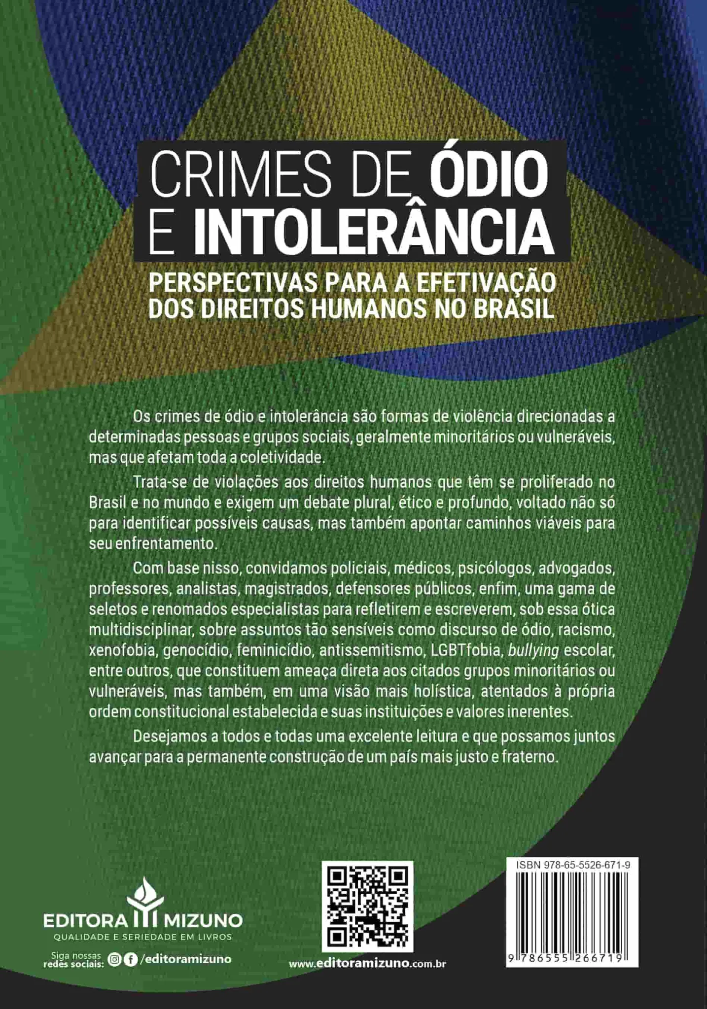 Com base nisso, convidamos policiais, médicos, psicólogos, advogados, professores, analistas, magistrados, defensores públicos, enfim, uma gama de seletos e renomados especialistas para refletirem e escreverem, sob essa ótica multidisciplinar, sobre assuntos tão sensíveis como discurso de ódio, racismo, xenofobia, genocídio, feminicídio, antissemitismo, LGBTfobia, bullying escolar, entre outros, que constituem ameaça direta aos citados grupos minoritários ou vulneráveis, mas também, em uma visão mais holística, atentados à própria ordem constitucional estabelecida e suas instituições e valores inerentes.