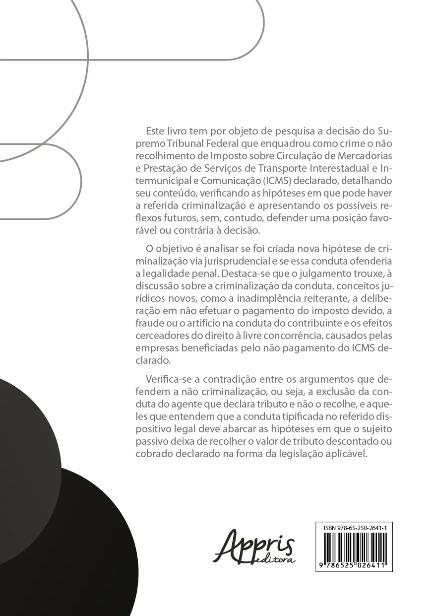 Este livro tem por objeto de pesquisa a decisão do Supremo Tribunal Federal que enquadrou como crime o não recolhimento de Imposto sobre Circulação de Mercadorias e Prestação de Serviços de Transporte Interestadual e Intermunicipal e Comunicação (ICMS) declarado, detalhando seu conteúdo, verificando as hipóteses em que pode haver a referida criminalização e apresentando os possíveis reflexos futuros, sem, contudo, defender uma posição favorável ou contrária à decisão.