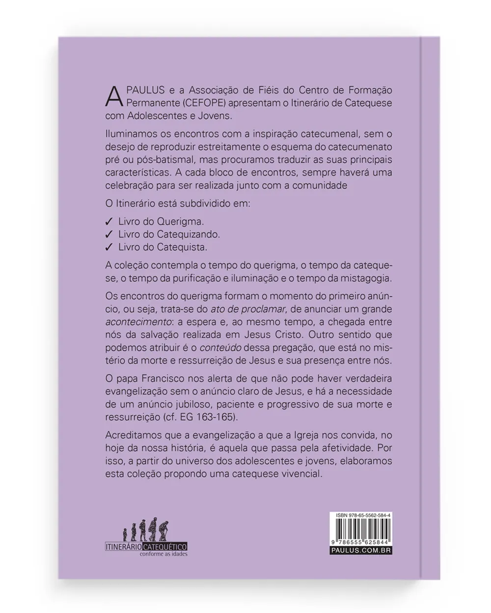 A CATEQUESE PAULUS e a Associação de Fiéis do Centro de Formação Permanente (CEFOPE) apresentam o Itinerário de Catequese com Adolescentes e Jovens. Iluminamos os encontros com a inspiração catecumenal, sem o desejo de reproduzir estreitamente o esquema do catecumenato pré ou pós-batismal, mas procuramos traduzir as suas principais características. A cada bloco de encontros, sempre haverá uma celebração para ser realizada junto com a comunidade O Itinerário está subdividido em: Livro do Querigma. Livro do Catequizando. Livro do Catequista. A coleção contempla o tempo do querigma, o tempo da catequese, o tempo da purificação e iluminação e o tempo da mistagogia.