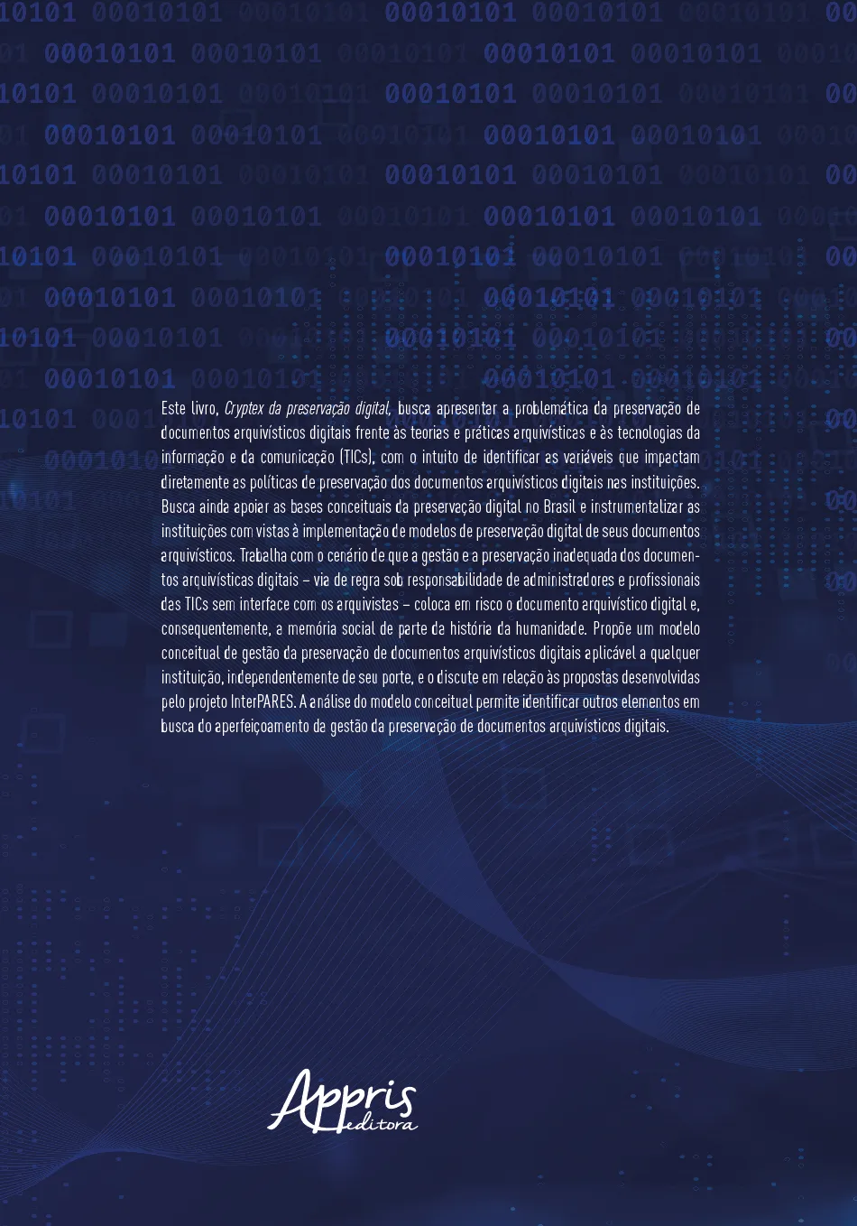Este livro, Cryptex da preservação digital, busca apresentar a problemática da preservação de documentos arquivísticos digitais frente às teorias e práticas arquivísticas e às tecnologias da informação e da comunicação (TICs), com o intuito de identificar as variáveis que impactam diretamente as políticas de preservação dos documentos arquivísticos digitais nas instituições. Busca ainda apoiar as bases conceituais da preservação digital no Brasil e instrumentalizar as instituições com vistas à implementação de modelos de preservação digital de seus documentos arquivísticos. Trabalha com o cenário de que a gestão e a preservação inadequada dos documentos arquivísticas digitais – via de regra sob responsabilidade de administradores e profissionais das TICs sem interface com os arquivistas – coloca em risco o documento arquivístico digital e, consequentemente, a memória social de parte da história da humanidade. Propõe um modelo conceitual de gestão da preservação de documentos arquivísticos digitais aplicável a qualquer instituição, independentemente de seu porte, e o discute em relação às propostas desenvolvidas pelo projeto InterPARES. A análise do modelo conceitual permite identificar outros elementos em busca do aperfeiçoamento da gestão da preservação de documentos arquivísticos digitais.