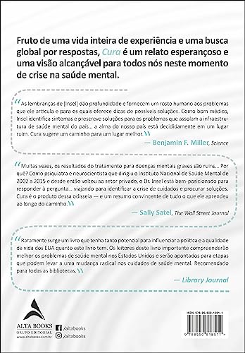 Fruto de uma vida inteira de experiência e uma busca global por respostas, Cura é um relato esperançoso e uma visão alcançável para todos nós neste momento de crise na saúde mental. As lembranças de [Insel] dão profundidade e fornecem um rosto humano aos problemas que ele articula e para os quais oferece dicas de possíveis soluções. Como bom médico, Insel identifica sintomas e prescreve soluções para os problemas que assolam a infraestrutura de saúde mental do país… a alma do nosso país está decididamente em um lugar ruim. Cura sugere um caminho para um lugar melhor.— Benjamin F. Miller, Science Muitas vezes, os resultados do tratamento para doenças mentais graves são ruins… Por quê? Como psiquiatra e neurocientista que dirigiu o Instituto Nacional de Saúde Mental de 2002 a 2015 e desde então voltou ao setor privado, o Dr. Insel está bem-posicionado para responder à pergunta… viajando para identificar a crise de cuidados e procurar soluções. Cura é o produto dessa odisseia — e um resumo convincente de tudo o que ele aprendeu ao longo do caminho.— Sally Satel, The Wall Street Journal Raramente surge um livro que tenha tanto potencial para influenciar a política e a qualidade de vida dos EUA quanto este livro tem. Os leitores deste livro importante compreenderão melhor os problemas de saúde mental nos Estados Unidos e serão apontados para etapas que podem levar a uma mudança radical nos cuidados de saúde mental. Recomendado para todas as bibliotecas.— Library Journal