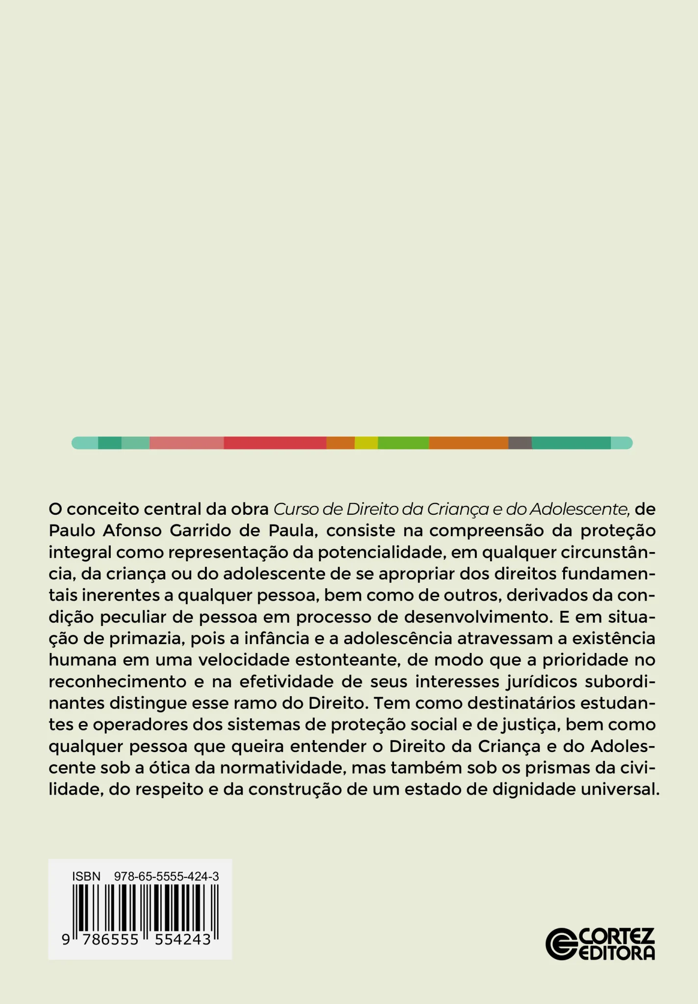 O conceito central da obra Curso de Direito da Criança e do Adolescente, de Paulo Afonso Garrido de Paula, consiste na compreensão da proteção integral como representação da potencialidade, em qualquer circunstância, da criança ou do adolescente de se apropriar dos direitos fundamentais inerentes a qualquer pessoa, bem como de outros, derivados da condição peculiar de pessoa em processo de desenvolvimento. E em situação de primazia, pois a infância e a adolescência atravessam a existência humana em uma velocidade estonteante, de modo que a prioridade no reconhecimento e na efetividade de seus interesses jurídicos subordinantes distingue esse ramo do Direito. Tem como destinatários estudantes e operadores dos sistemas de proteção social e de justiça, bem como qualquer pessoa que queira entender o Direito da Criança e do Adolescente sob a ótica da normatividade, mas também sob os prismas da civilidade, do respeito e da construção de um estado de dignidade universal.
