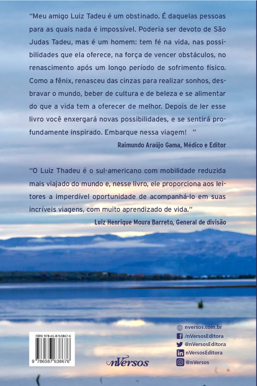 Luiz Thadeu realiza o sonho que muitos têm: o de conhecer o mundo. Da Terra do Fogo na Argentina, ao Alasca nos Estados Unidos, já são mais de 140 países visitados e mais inúmeros planos de novas viagens e aventuras. Luiz Thadeu é hoje o sul-americano com mobilidade reduzida que mais viajou pelo mundo. Em “Das muletas fiz asas”, o leitor acompanhará a trajetória de vida desse brasileiro de espírito corajoso, que conseguiu vencer as dificuldades físicas, emocionais e financeiras e alcançou o mundo. São histórias inspiradoras de viagens, pessoas,