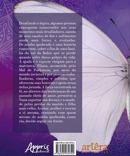 Desafiando a lógica, algumas pessoas conseguem transcender nos seus momentos mais desafiadores, saindo de seus casulos de dor e sofrimento ainda mais fortes e evoluídas. De asinha quebrada é uma história comovente, sobre o fim de uma família do sul da Bahia que se perde quando sofre duros golpes da vida. A ajuda e o suporte chegam para a matriarca, Eliana, acometida pelo Mal de Parkinson, por meio do mundo invisível e por pessoas trabalhadoras, simples e sofridas que oferecem suas histórias e apoio nessa árdua jornada. A força encontrada na fé, no alicerce das lembranças de um passado cheio de amor, permitem a Nana suportar sua doença e a saudade pelas perdas do marido e filho mais velho. Aceitar, acolher e recriar a si mesma, contando com quem mesmo de asinha quebrada, como ela, decide seguir em frente.