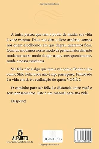 A única pessoa que tem o poder de mudar sua vida é você mesmo. Deus nos deu o livre-arbítrio, somos nós quem escolhemos em que degrau queremos ficar. Quando mudamos nosso modo de pensar, naturalmente mudamos nosso modo de agir, o que, consequentemente, muda a nossa existência. Ser feliz não é algo que tem a ver com o Poder e sim com o SER. Felicidade não é algo passageiro. Felicidade é a vida em si, é a realização de quem VOCÊ é. O caminho para ser feliz é a distância entre você e seus pensamentos. Este é um manual para sua vida. Desperte!
