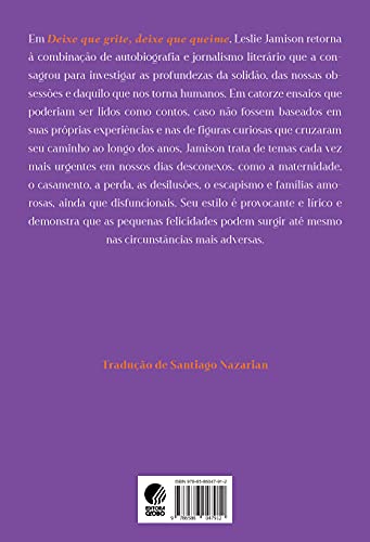 Coletânea de ensaios de Leslie Jamison, uma das mais aclamadas ensaístas da atualidade Em Deixe que grite, deixe que queime, Leslie Jamison retorna à combinação de autobiografia e jornalismo literário que a consagrou para investigar as profundezas da solidão, das nossas obsessões e daquilo que nos torna humanos. A obra reúne catorze ensaios que poderiam ser lidos como contos, caso não fossem baseados em suas próprias experiências e nas de figuras curiosas que cruzaram seu caminho ao longo dos anos. A autora trata de temas cada vez mais urgentes em nossos dias desconexos, como a maternidade, o casamento, a perda, as desilusões, o escapismo e famílias amorosas, ainda que disfuncionais. Seu estilo é provocante e lírico e demonstra que as pequenas felicidades podem surgir até mesmo nas circunstâncias mais adversas.