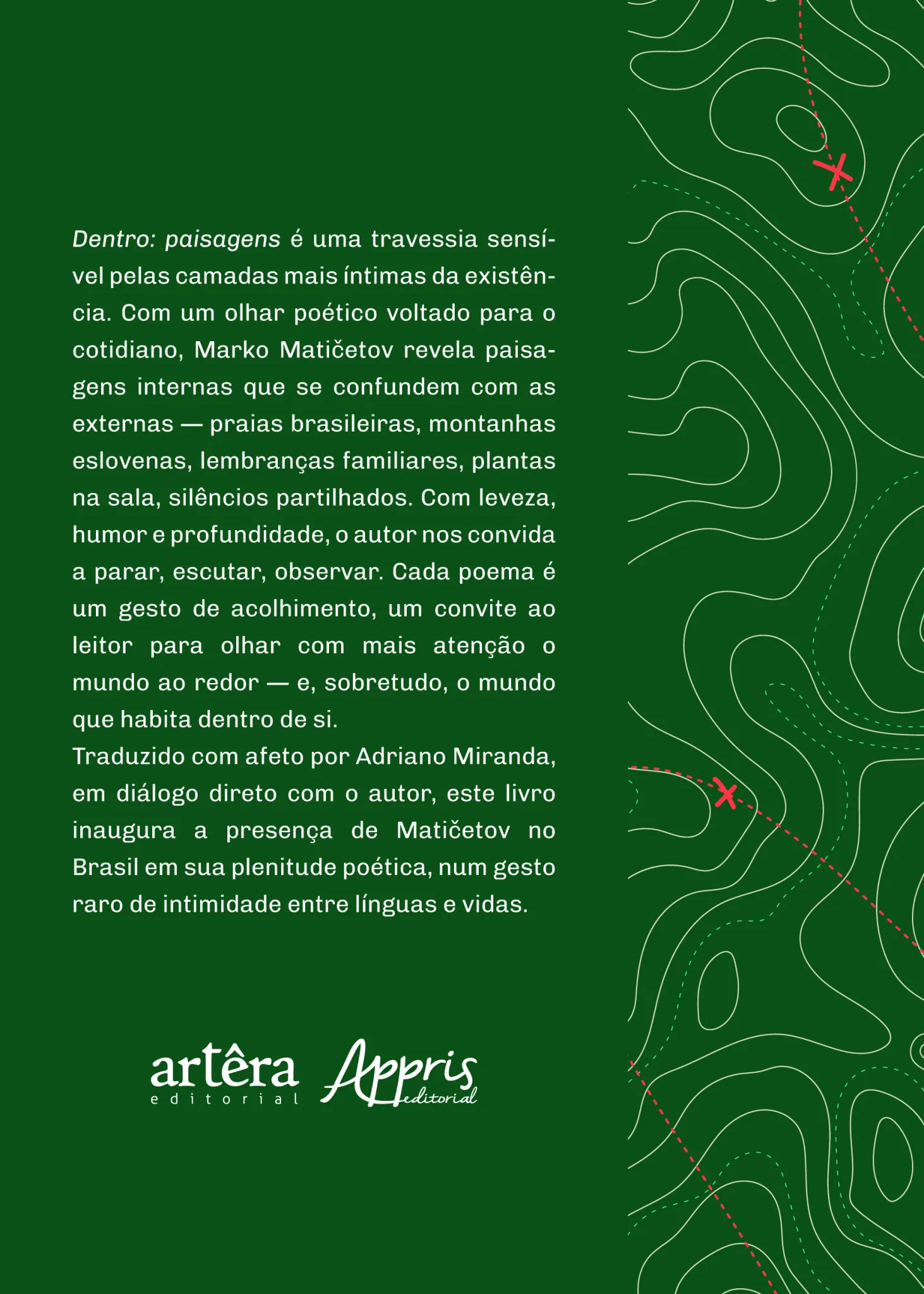Dentro: paisagens é uma travessia sensível pelas camadas mais íntimas da existência. Com um olhar poético voltado para o cotidiano, Marko Matičetov revela paisagens internas que se confundem com as externas — praias brasileiras, montanhas eslovenas, lembranças familiares, plantas na sala, silêncios partilhados. Com leveza, humor e profundidade, o autor nos convida a parar, escutar, observar. Cada poema é um gesto de acolhimento, um convite ao leitor para olhar com mais atenção omundo ao redor — e, sobretudo, o mundo que habita dentro de si.