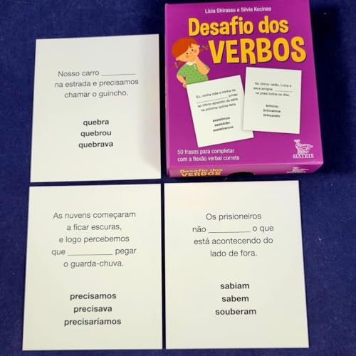 Verbos são palavras que designam fatos representados no tempo, como uma ação, um estado ou um fenômeno. Flexionam-se em número, pessoa, tempo e modo. Por serem o centro das orações, são de extrema importância em nossa comunicação. Este livro-caixinha® traz 50 cartas, cada uma com uma frase e três opções de flexão verbal. A criança deve ler e determinar aquela que se encaixa para a frase ficar correta. Uma obra que vai ajudar as crianças a pensarem sobre o uso correto dos verbos, tanto na expressão falada como na escrita.