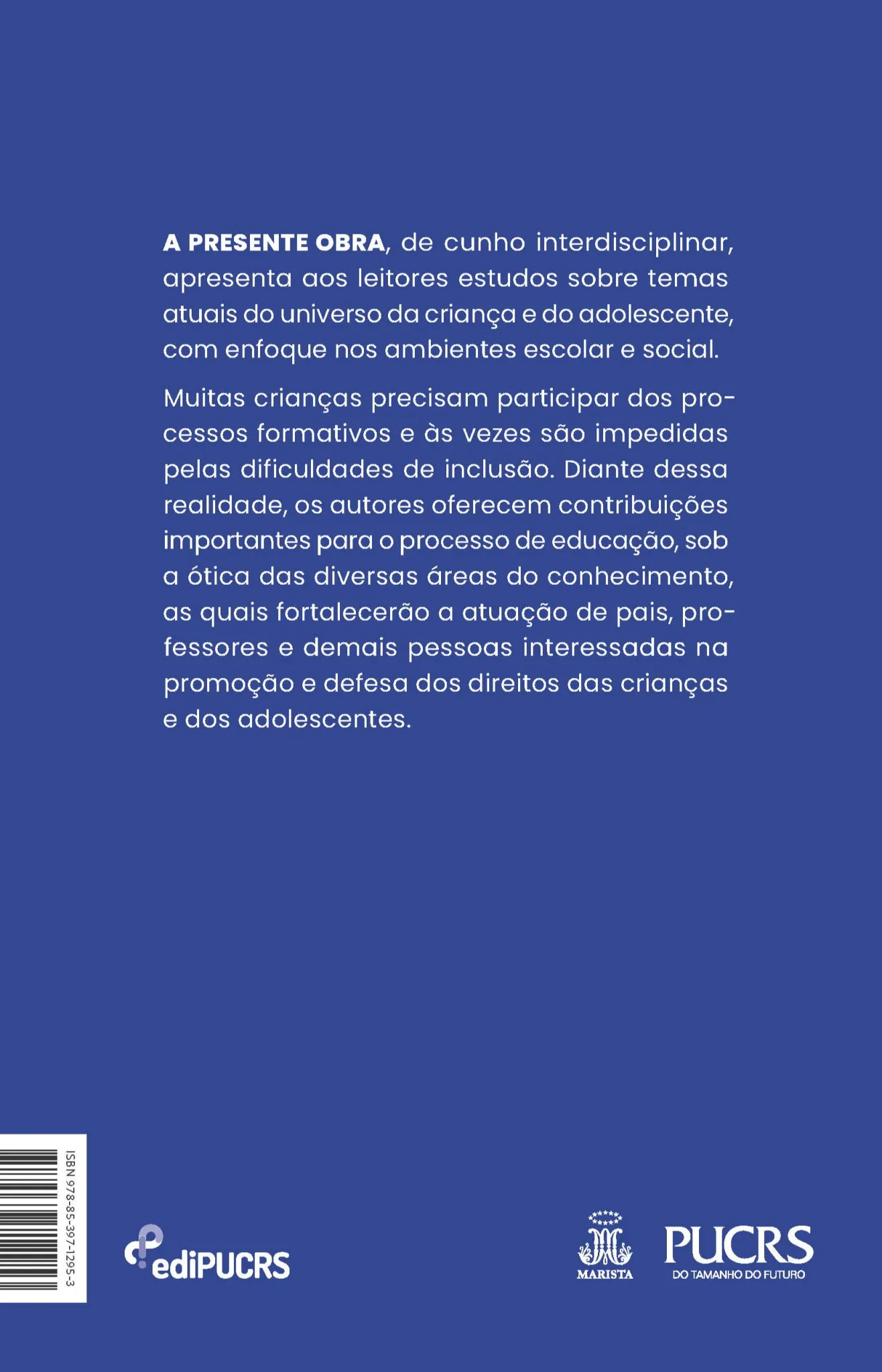 A presente obra, de cunho interdisciplinar, apresenta aos leitores estudos sobre temas atuais do universo da criança e do adolescente, com enfoque nos ambientes escolar e social. Muitas crianças precisam participar dos processos formativos e às vezes são impedidas pelas dificuldades de inclusão. Diante dessa realidade, os autores oferecem contribuições importantes para o processo de educação, sob a ótica das diversas áreas do conhecimento, as quais fortalecerão a atuação de pais, professores e demais pessoas interessadas na promoção e defesa dos direitos das crianças e dos adolescentes.