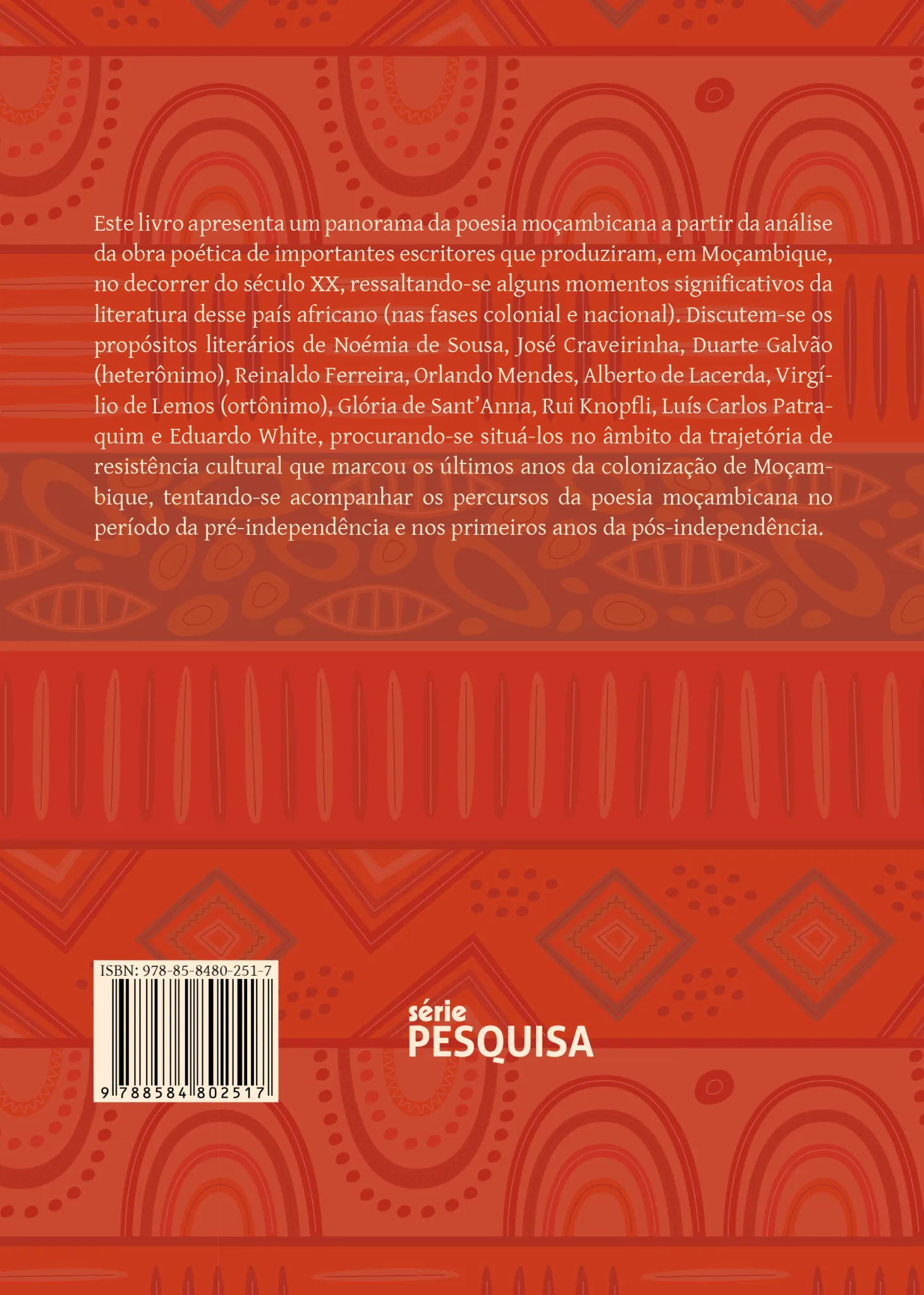 Este livro apresenta um panorama da poesia moçambicana a partir da análise da obra poética de importantes escritores que produziram, em Moçambique, no decorrer do século XX, ressaltando-se alguns momentos significativos da literatura desse país africano (nas fases colonial e nacional). Discutem-se os propósitos literários de Noémia de Sousa, José Craveirinha, Duarte Galvão (heterônimo), Reinaldo Ferreira, Orlando Mendes, Alberto de Lacerda, Virgílio de Lemos (ortônimo), Glória de Sant’Anna, Rui Knopfli, Luís Carlos Patraquim e Eduardo White, procurando-se situá-los no âmbito da trajetória de resistência cultural que marcou os últimos anos da colonização de Moçambique, tentando-se acompanhar os percursos da poesia moçambicana no período da pré-independência e nos primeiros anos da pós-independência.