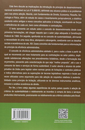Este livro discute as implicações da introdução do princípio do desenvolvimento nacional sustentável na Lei nº 8.666/93, definindo seu alcance prático e os problemas para sua plena adoção. Aborda, com fundamentos do Direito, Economia, Filosofia, Sociologia e Física, além do estudo de casos e levantamento jurisprudencial, a dialética existente entre antigos e novos conceitos aplicados à licitação, acentuando as forças e deficiências de cada um, bem como afinidades e contradições. O texto apresenta um estudo sobre o conceito de desenvolvimento desde suas primeiras formulações, até chegar naquela que o autor julga adequada à Constituição Federal de 1988. Em seguida, aprofunda-se no conceito de sustentabilidade, afirmando a necessidade de um a nova ética, atemporal e abrangente, condizente com os desafios sociais e econômicos do séc. XIX. Esses conceitos são fundamentais para a reformulação do princípio da eficiência administrativa. O conceito de eficiência administrativa adotado é, par a o autor, a base a partir da qual se recomenda um novo tratamento para as contratações no setor público, implicando substanciais alterações nos procedimentos licitatórios, desde a formulação dos orçamentos, passando pela caracterização do que seja “ melhor proposta”, até o uso e consumo de bens e serviços de forma sustentável.