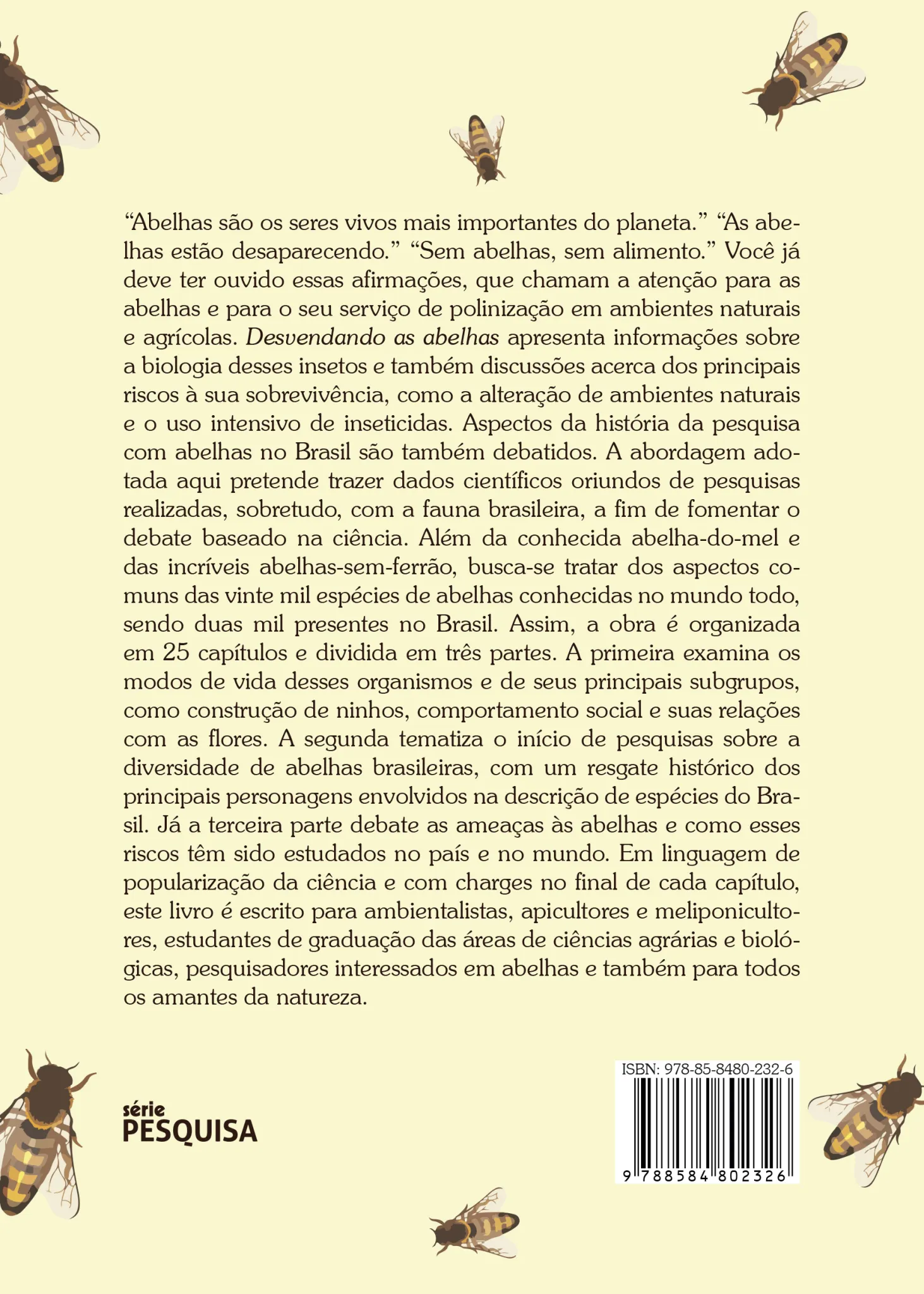 “Abelhas são os seres vivos mais importantes do planeta.” “As abelhas estão desaparecendo.” “Sem abelhas, sem alimento.” Você já deve ter ouvido essas afirmações, que chamam a atenção para as abelhas e para o seu serviço de polinização em ambientes naturais e agrícolas. Desvendando as abelhas apresenta informações sobre a biologia desses insetos e também discussões acerca dos principais riscos à sua sobrevivência, como a alteração de ambientes naturais e o uso intensivo de inseticidas. Aspectos da história da pesquisa com abelhas no Brasil são também debatidos. A abordagem adotada aqui pretende trazer dados científicos oriundos de pesquisas realizadas, sobretudo, com a fauna brasileira, a fim de fomentar o debate baseado na ciência. Além da conhecida abelha-do-mel e das incríveis abelhas-sem-ferrão, busca-se tratar dos aspectos comuns das vinte mil espécies de abelhas conhecidas no mundo todo, sendo duas mil presentes no Brasil. Assim, a obra é organizada em 25 capítulos e dividida em três partes. A primeira examina os modos de vida desses organismos e de seus principais subgrupos, como construção de ninhos, comportamento social e suas relações com as flores. A segunda tematiza o início de pesquisas sobre a diversidade de abelhas brasileiras, com um resgate histórico dos principais personagens envolvidos na descrição de espécies do Brasil. Já a terceira parte debate as ameaças às abelhas e como esses riscos têm sido estudados no país e no mundo. Em linguagem de popularização da ciência e com charges no final de cada capítulo, este livro é escrito para ambientalistas, apicultores e meliponicultores, estudantes de graduação das áreas de ciências agrárias e biológicas, pesquisadores interessados em abelhas e também para todos os amantes da natureza.