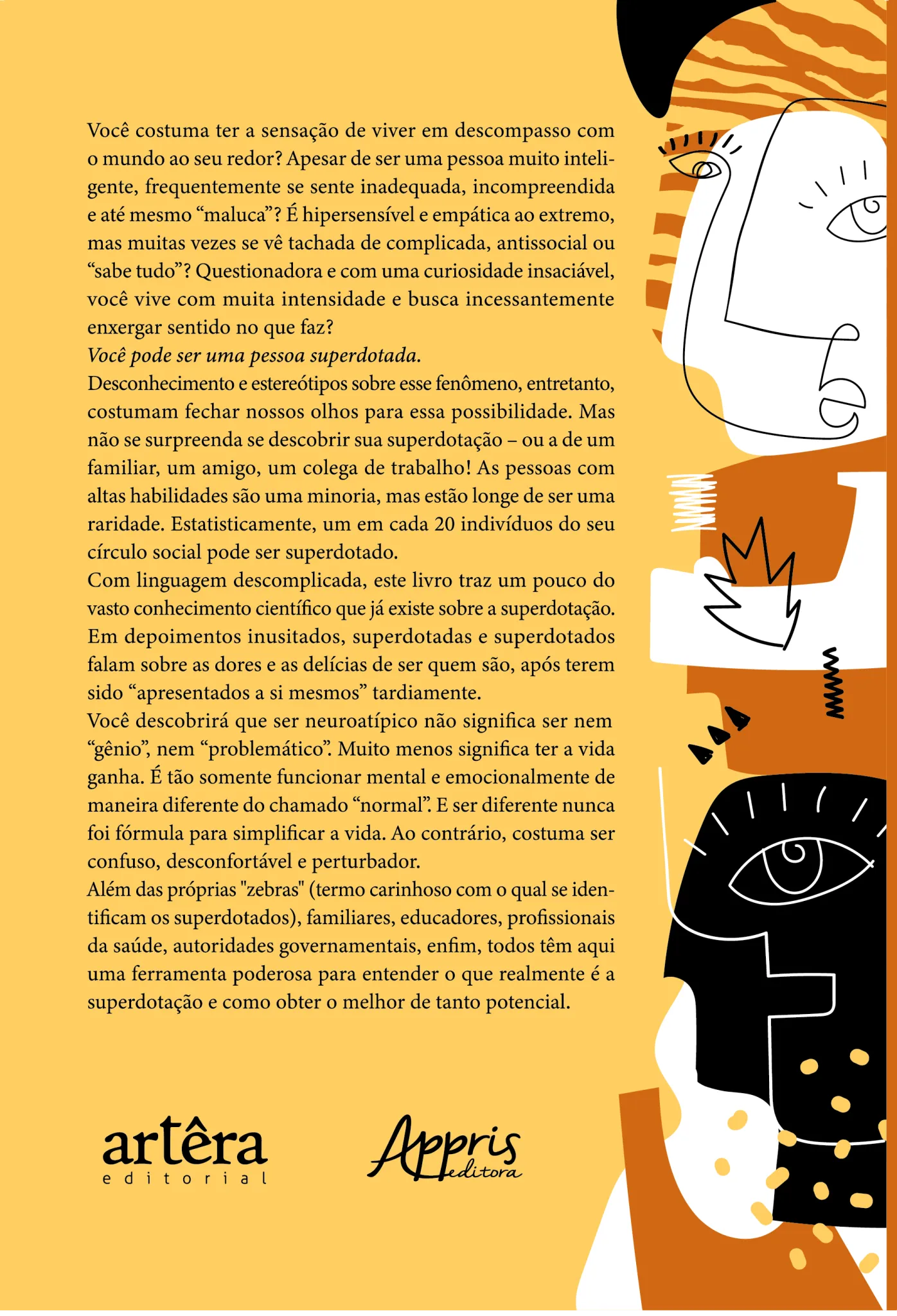 Você costuma ter a sensação de viver em descompasso com o mundo ao seu redor? Apesar de ser uma pessoa muito inteligente, frequentemente se sente inadequada, incompreendida e até mesmo “maluca”? É hipersensível e empática ao extremo, mas muitas vezes se vê tachada de complicada, antissocial ou “sabe tudo”? Questionadora e com uma curiosidade insaciável, você vive com muita intensidade e busca incessantemente enxergar sentido no que faz? Você pode ser uma pessoa superdotada. Desconhecimento e estereótipos sobre esse fenômeno, entretanto, costumam fechar nossos olhos para essa possibilidade. Mas não se surpreenda se descobrir sua superdotação – ou a de um familiar, um amigo, um colega de trabalho! As pessoas com altas habilidades são uma minoria, mas estão longe de ser uma raridade. Estatisticamente, um em cada 20 indivíduos do seu círculo social pode ser superdotado. Com linguagem descomplicada, este livro traz um pouco do vasto conhecimento científico que já existe sobre a superdotação. Em depoimentos inusitados, superdotadas e superdotados falam sobre as dores e as delícias de ser quem são, após terem sido “apresentados a si mesmos” tardiamente. Você descobrirá que ser neuroatípico não significa ser nem “gênio”, nem “problemático”. Muito menos significa ter a vida ganha. É tão somente funcionar mental e emocionalmente de maneira diferente do chamado “normal”. E ser diferente nunca foi fórmula para simplificar a vida. Ao contrário, costuma ser confuso, desconfortável e perturbador. Além das próprias “zebras” (termo carinhoso com o qual se identificam os superdotados), familiares, educadores, profissionais da saúde, autoridades governamentais, enfim, todos têm aqui uma ferramenta poderosa para entender o que realmente é a superdotação e como obter o melhor de tanto potencial.