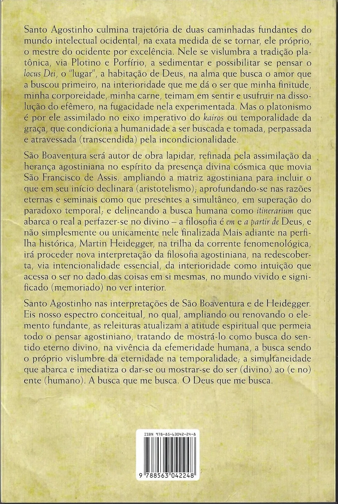 Santo Agostinho culmina trajetória de duas caminhadas fundantes do mundo intelectual ocidental, na exata medida de se tornar, ele próprio, o mestre do ocidente por excelência. Nele se vislumbra a tradição pla- tônica, via Plotino e Porfírio, a sedimentar e possibilitar se pensar o locus Dei, o “lugar”, a habitação de Deus, na alma que busca o amor que a buscou primeiro, na interioridade que me dá o ser que minha finitude, minha corporeidade, minha carne, teimam em sentir e usufruir na disso- lução do efêmero, na fugacidade nela experimentada. Mas o platonismo é por ele assimilado no eixo imperativo do kairos ou temporalidade da graça, que condiciona a humanidade a ser buscada e tomada, perpassada e atravessada (transcendida) pela incondicionalidade. São Boaventura será autor de obra lapidar, refinada pela assimilação da herança agostiniana no espírito da presença divina cósmica que movia São Francisco de Assis. ampliando a matriz agostiniana para incluir o que em seu início declinara (aristotelismo); aprofundando-se nas razões eternas e seminais como que presentes a simultâneo, em superação do paradoxo temporal; e delineiando a busca humana como itinerarium que abarca o real a perfazer-se no divino – a filosofia é em e a partir de Deus, e não simplesmente ou unicamente nele finalizada Mais adiante na perfi- lha histórica, Martin Heidegger, na trilha da corrente fenomenológica,