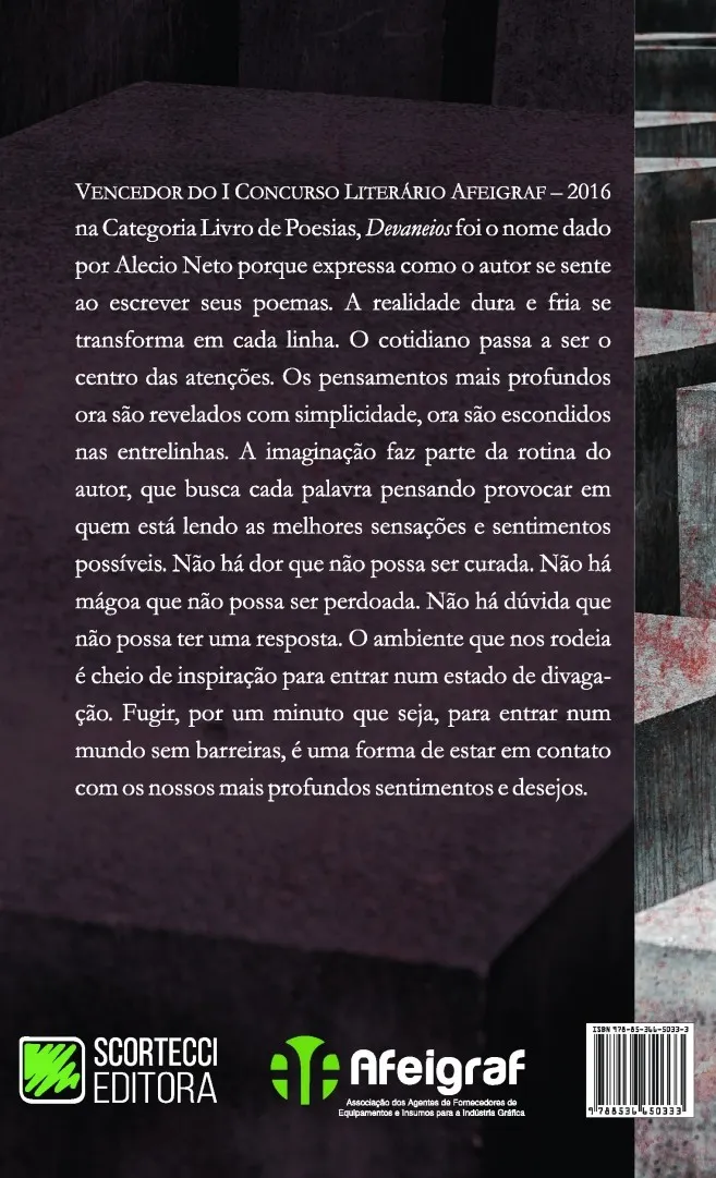 Vencedor do I Concurso Literário Afeigraf – 2016 na Categoria Livro de Poesias, Devaneios foi o nome dado por Alecio Neto porque expressa como o autor se sente ao escrever seus poemas. A realidade dura e fria se transforma em cada linha. O cotidiano passa a ser o centro das atenções. Os pensamentos mais profundos ora são revelados com simplicidade, ora são escondidos nas entrelinhas. A imaginação faz parte da rotina do autor, que busca cada palavra pensando provocar em quem está lendo as melhores sensações e sentimentos possíveis. Não há dor que não possa ser curada. Não há mágoa que não possa ser perdoada. Não há dúvida que não possa ter uma resposta. O ambiente que nos rodeia é cheio de inspiração para entrar num estado de divagação. Fugir, por um minuto que seja, para entrar num mundo sem barreiras, é uma forma de estar em contato com os nossos mais profundos sentimentos e desejos.