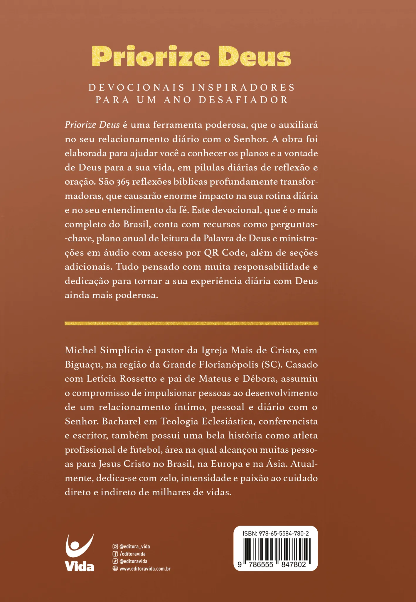 Priorize Deus é uma ferramenta poderosa, que o auxiliará no seu relacionamento diário com o Senhor. A obra foi elaborada para ajudar você a conhecer os planos e a vontade de Deus para a sua vida, em pílulas diárias de reflexão e oração. São 365 reflexões bíblicas profundamente transformadoras, que causarão enorme impacto na sua rotina diária e no seu entendimento da fé. Este devocional, que é o mais completo do Brasil, conta com recursos como perguntas-chave, plano anual de leitura da Palavra de Deus e ministrações em áudio com acesso por QR Code, além de seções adicionais. Tudo pensado com muita responsabilidade e dedicação para tornar a sua experiência diária com Deus ainda mais poderosa.