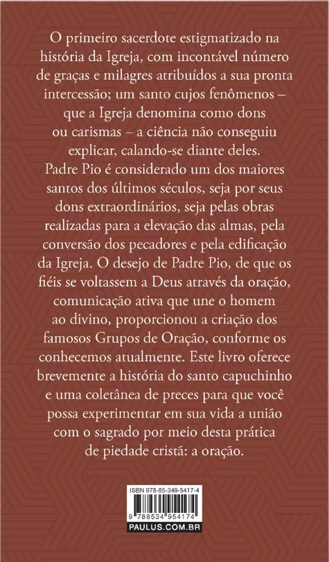Este livro apresenta uma breve biografia de Padre Pio – primeiro sacerdote estigmatizado na história da Igreja, com incontáveis graças e milagres atribuídos a sua intercessão – e uma coletânea de preces para ajudar o leitor a experimentar em sua vida a união com o sagrado, uma vez que era desejo do Santo de Pietrelcina que os fiéis se voltassem a Deus por meio da oração, prática de piedade cristã que conecta o homem ao divino.
