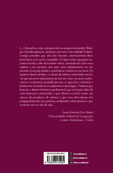Diálogos interdisciplinares: formação continuada na educação básica, é uma coletânea e resultado de “diálogos” promovidos entre os professores da UFGD e da escola de educação básica. Os textos que constituem esse livro abordam questões como a formação continuada dos professores e profissionais da educação da rede básica de ensino considerando a cidade de dourados/MS, também abordando as “vivências e desafios na aprendizagem”, que contribuem no processo de desenvolvimento do profissional docente.