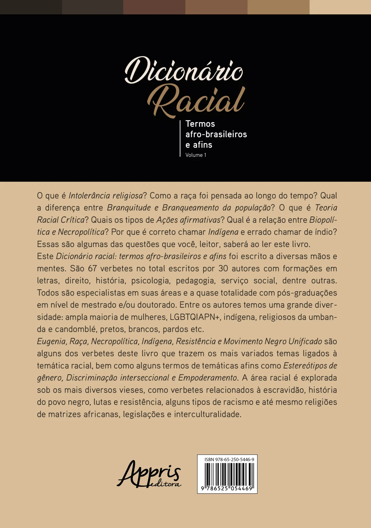 Este Dicionário racial: termos afro-brasileiros e afins foi escrito a diversas mãos e mentes. São 67 verbetes no total escritos por 30 autores com formações em letras, direito, história, psicologia, pedagogia, serviço social, dentre outras. Todos são especialistas em suas áreas e a quase totalidade com pós-graduações em nível de mestrado e/ou doutorado. Entre os autores temos uma grande diversidade: ampla maioria de mulheres, LGBTQIAPN+, indígena, religiosos da umbanda e candomblé, pretos, brancos, pardos etc.