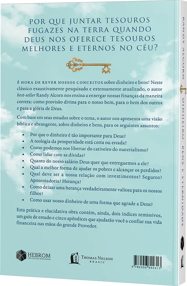 É hora de rever nossos conceitos sobre dinheiro e bens! Neste clássico exaustivamente pesquisado e extensamente atualizado, o autor best-seller Randy Alcorn nos ensina a enxergar nossas finanças da maneira correta: como provisão divina para o nosso bem, para o bem dos outros e para a glória de Deus. Com base em seus estudos sobre o tema, o autor nos apresenta uma visão bíblica e abrangente, sobre dinheiro e bens, para os seguintes assuntos: • Por que o dinheiro é tão importante para Deus? • A teologia da prosperidade está certa ou errada? • Como podemos nos libertar do cativeiro do materialismo? • Como lidar com as dívidas? • Quanto do nosso salário Deus quer que entreguemos a ele? • Qual a melhor forma de ajudar os pobres e alcançar os perdidos? • Qual deve ser a nossa relação com investimentos? Seguros? Aposentadoria? Herança? • Como deixar uma herança verdadeiramente valiosa para os nossos filhos? • Como usar nosso dinheiro de uma forma que agrade a Deus? Esta prática e elucidativa obra contém, ainda, dois índices remissivos, um guia de estudo e cinco apêndices que ajudarão você a confiar sua vida financeira nas mãos do grande Provedor.