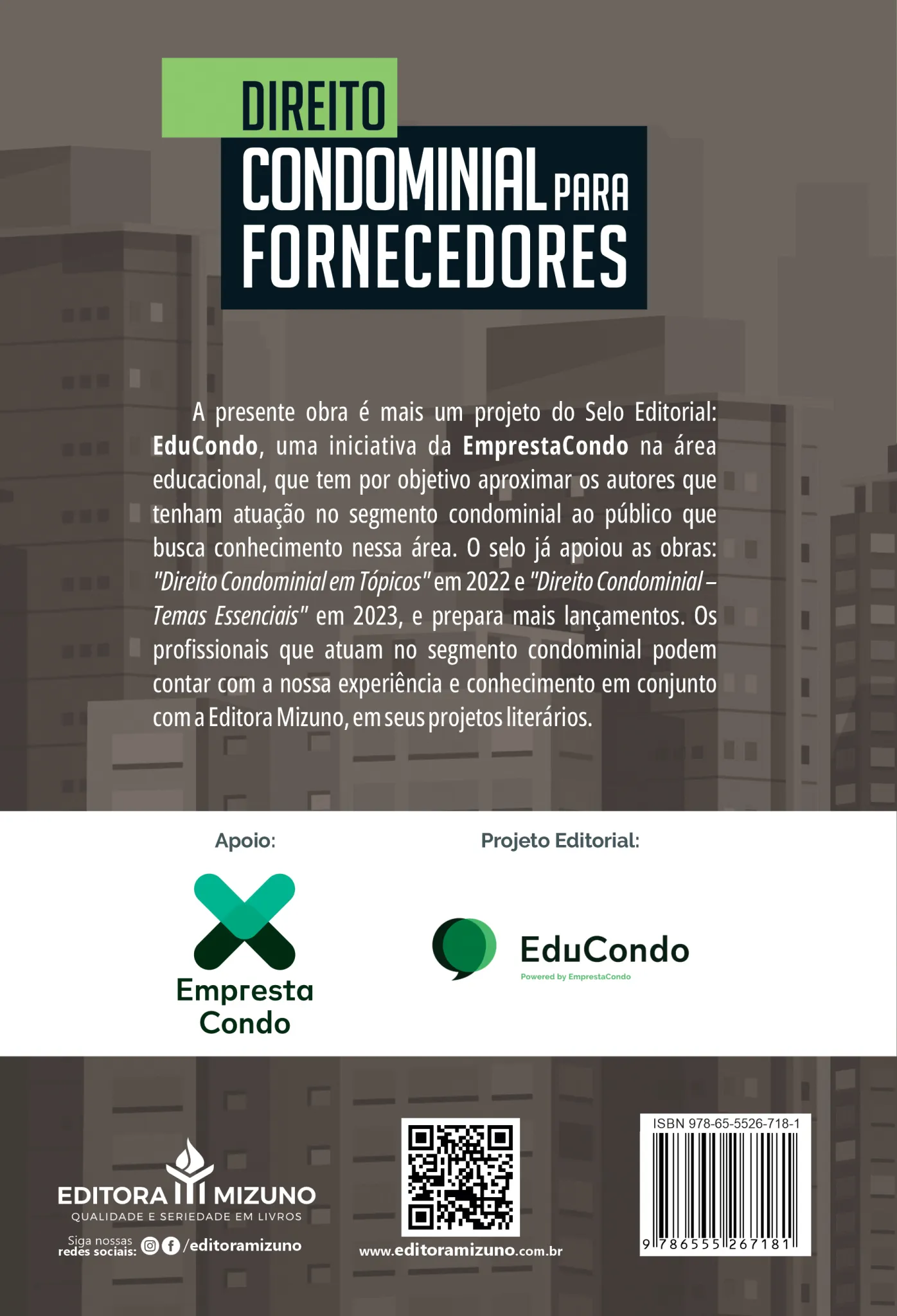 A presente obra é mais um projeto do Selo Editorial: EduCondo, uma iniciativa da EmprestaCondo na área educacional, que tem por objetivo aproximar os autores que tenham atuação no segmento condominial ao público que busca conhecimento nessa área. O selo já apoiou as obras: “Direito Condominial em Tópicos” em 2022 e “Direito Condominial – Temas Essenciais” em 2023, e prepara mais lançamentos. Os profissionais que atuam no segmento condominial podem contar com a nossa experiência e conhecimento em conjunto com a Editora Mizuno, em seus projetos literários.