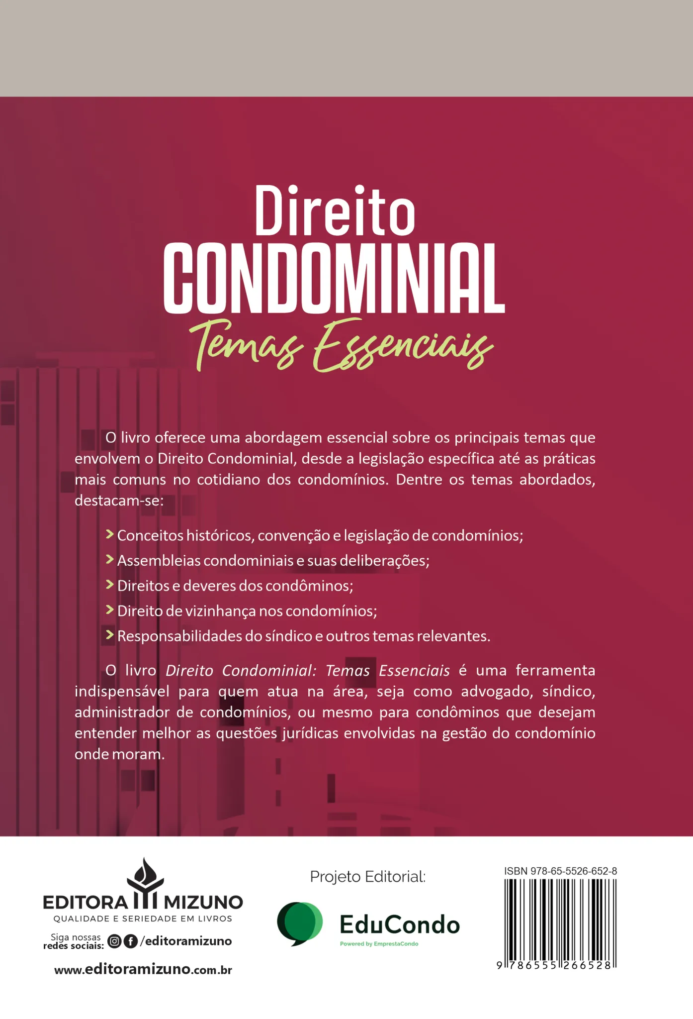 O livro Direito Condominial: Temas Essenciais é uma ferramenta indispensável para quem atua na área, seja como advogado, síndico, administrador de condomínios, ou mesmo para condôminos que desejam entender melhor as questões jurídicas envolvidas na gestão do condomínio onde moram.