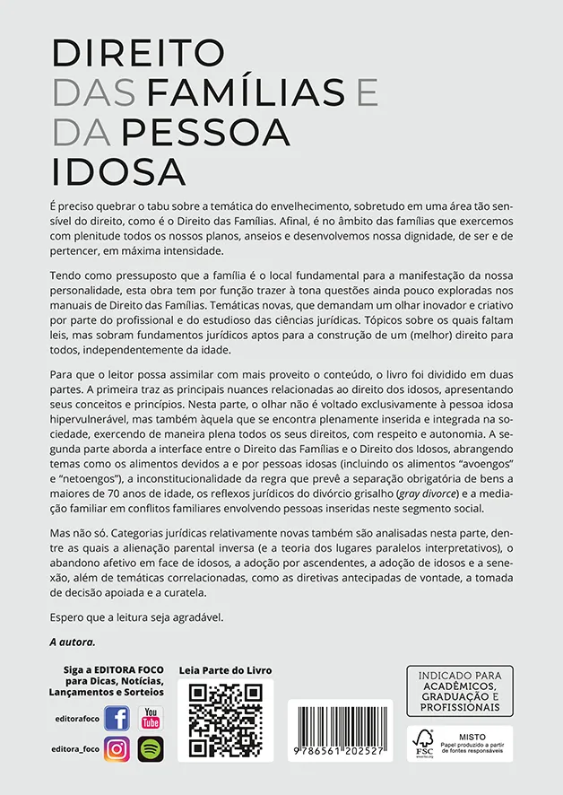Para que o leitor possa assimilar com mais proveito o conteúdo, o livro foi dividido em duas partes. A primeira traz as principais nuances relacionadas ao direito dos idosos, apresentando seus conceitos e princípios. Nesta parte, o olhar não é voltado exclusivamente à pessoa idosa hipervulnerável, mas também àquela que se encontra plenamente inserida e integrada na sociedade, exercendo de maneira plena todos os seus direitos, com respeito e autonomia. A segunda parte aborda a interface entre o Direito das Famílias e o Direito dos Idosos, abrangendo temas como os alimentos devidos a e por pessoas idosas (incluindo os alimentos “avoengos” e “netoengos”), a inconstitucionalidade da regra que prevê a separação obrigatória de bens a maiores de 70 anos de idade, os reflexos jurídicos do divórcio grisalho (gray divorce) e a mediação familiar em conflitos familiares envolvendo pessoas inseridas neste segmento social.
