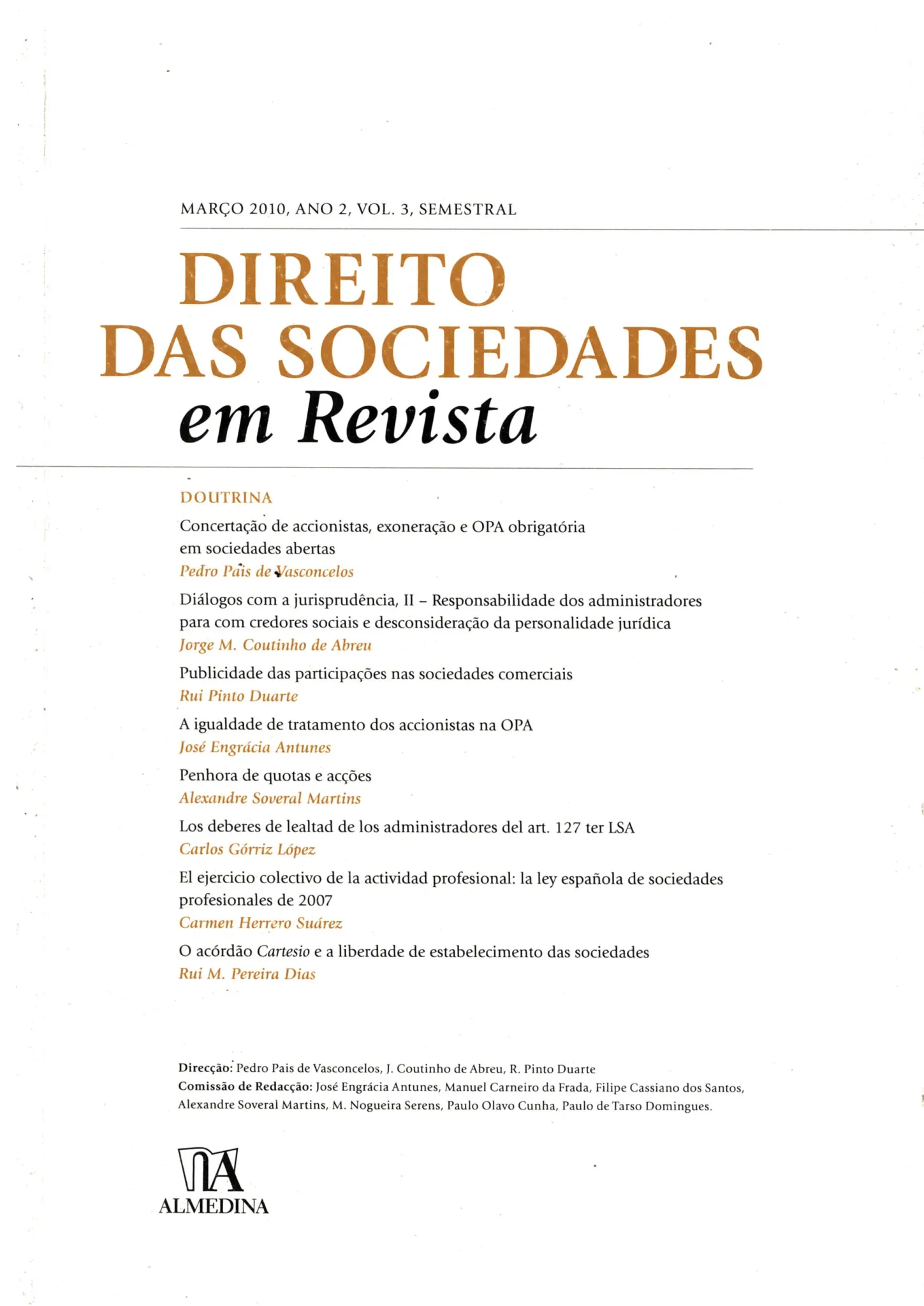 “Direito das sociedades em revista” traz os seguintes temas: Doutrina; Concertação de acionistas, exoneração e OPA obrigatória em sociedades abertas (Pedro Pais de Vasconcelos); Diálogos com a jurisprudência, II – Responsabilidade dos administradores para com credores sociais e desconsideração da personalidade jurídica (Jorge M.Coutinho de Abreu); Publicidade das participações nas sociedades comerciais (Rui Pinto Duarte); A igualdade de tratamento dos acionistas na OPA (José Engrácia Antunes); Penhora de quotas e ações (Alexandre Soveral Martins); Los deberes de lealtad de los administradores del art. 127 ter LSA (Carlos Górriz López); El ejercicio colectivo de la actividad profesional. La ley española de sociedades profesionales de 2007 (Carmen Herrero Suárez); O acórdão Cartesio e a liberdade de estabelecimento das sociedades (Rui M. Pereira Dias).