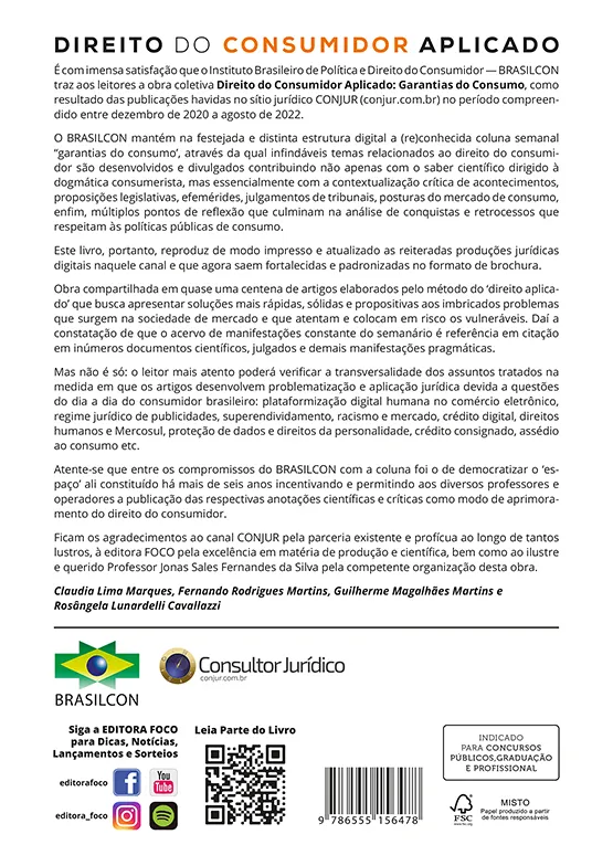 É com imensa satisfação que o Instituto Brasileiro de Política e Direito do Consumidor – BRASILCON traz aos leitores a obra coletiva ‘direito do consumidor aplicado: garantias do consumo’, como resultado das publicações havidas no sítio jurídico CONJUR (conjur.com.br) no período compreendido entre dezembro de 2020 a agosto de 2022.