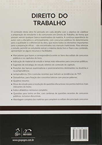 Indicação de material de estudo e temas relevantes para concursos públicos; Sugestão de estratégia de estudo; Posições das bancas e posicionamentos dominantes na doutrina e na jurisprudência; Jurisprudência, OJs e súmulas recentes que indicam as tendências do TST; Deixadinhas, para fixação dos conceitos básicos; Quadros-resumo; Dicas de estudo para a resolução de questões discursivas nos pontos teóricos mais relevantes do texto; Índice alfabético-remissivo completo; Questões para treino on-line, com centenas de questões recentes de concursos públicos, inclusive discursivas. Abordagem completa das matérias que compõem os editais dos principais concursos.