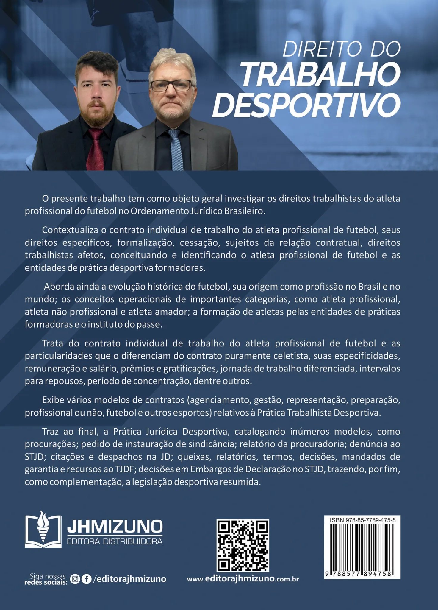 O presente trabalho tem como objeto geral investigar os direitos trabalhistas do atleta profissional do futebol no Ordenamento Jurídico Brasileiro. Contextualiza o contrato individual de trabalho do atleta profissional de futebol, seus direitos específicos, formalização, cessação, sujeitos da relação contratual, direitos trabalhistas afetos, conceituando e identificando o atleta profissional de futebol e as entidades de prática desportiva formadoras. Aborda ainda a evolução histórica do futebol, sua origem como profissão no Brasil e no mundo; os conceitos operacionais de importantes categorias, como atleta profissional, atleta não profissional e atleta amador; a formação de atletas pelas entidades de práticas formadoras e o instituto do passe. Trata do contrato individual de trabalho do atleta profissional de futebol e as particularidades que o diferenciam do contrato puramente celetista, suas especificidades, remuneração e salário, prêmios e gratificações, jornada de trabalho diferenciada, intervalos para repousos, período de concentração, dentre outros. Exibe vários modelos de contratos (agenciamento, gestão, representação, preparação, profissional ou não, futebol e outros esportes) relativos à Prática Trabalhista Desportiva. Traz ao final, a Prática Jurídica Desportiva, catalogando inúmeros modelos, como procurações; pedido de instauração de sindicância; relatório da procuradoria; denúncia ao STJD; citações e despachos na JD; queixas, relatórios, termos, decisões, mandados de garantia e recursos ao TJDF; decisões em Embargos de Declaração no STJD, trazendo, por fim, como complementação, a legislação desportiva resumida.