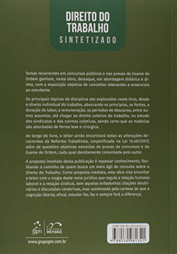 Temas recorrentes em concursos públicos e nas provas do Exame de Ordem ganham, nesta obra, destaque, em abordagem didática e direta, com a exposição objetiva de conceitos relevantes e essenciais ao estudante. Os principais tópicos da disciplina são explorados neste livro, desde o direito individual do trabalho, abarcando os princípios, as fontes, a duração do labor, a remuneração, os períodos de descanso, entre outros assuntos, até chegar ao direito coletivo do trabalho, no estudo dos sindicatos e das normas coletivas, sendo certo que as matérias são abordadas de forma leve e cirúrgica. Ao longo do livro, o leitor ainda encontrará todas as alterações decorrentes da Reforma Trabalhista, corporificada na Lei 13.467/2017, além de questões objetivas extraídas de provas de concursos e do Exame de Ordem, cada qual devidamente comentada pelo autor. A proposta imediata desta publicação é repassar conhecimento, facilitando o caminho de quem busca um meio ágil de consulta sobre o Direito do Trabalho. Como proposta mediata, esta obra visa encantar o leitor com a magia deste ramo jurídico que regula a relação humana laboral e a relação sindical, sem aquelas enfadonhas citações doutrinárias e discussões cerebrinas, mas sombreada pela certeza de que a cognição liberta; afinal, estudar fez, faz e sempre fará a diferença.