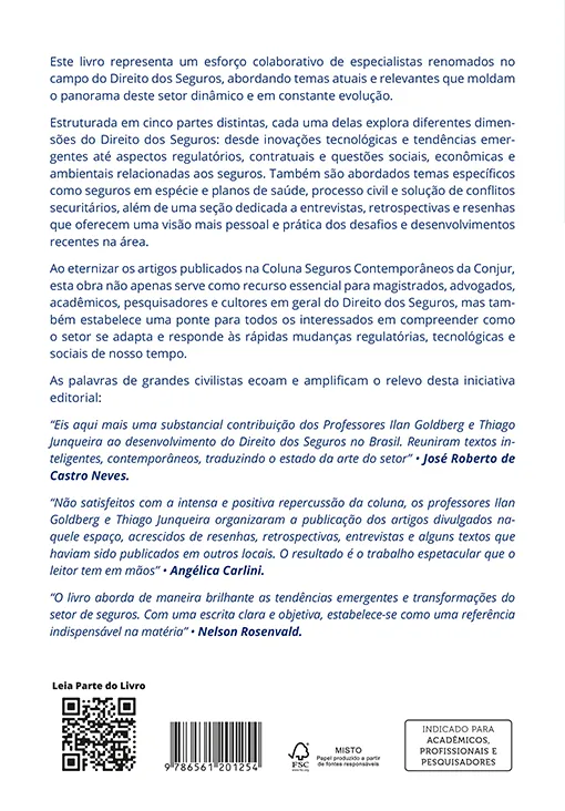 “Eis aqui mais uma substancial contribuição dos Professores Ilan Goldberg e Thiago Junqueira ao desenvolvimento do Direito dos Seguros no Brasil. Reuniram textos inteligentes, contemporâneos, traduzindo o estado da arte do setor”. (José Roberto de Castro Neves).