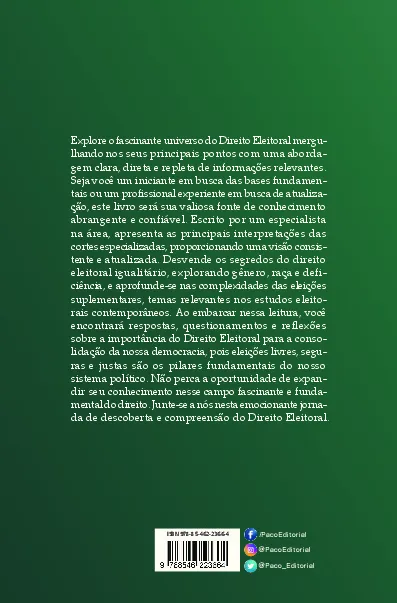 Explore os principais pontos da legislação e da jurisprudência eleitoral nesta obra que apresenta uma abordagem clara e direta. Seja você um iniciante em busca de conhecimento ou um profissional experiente em busca de consulta rápida, encontrará neste livro uma valiosa fonte sobre o fascinante campo do Direito Eleitoral. Descubra o vasto universo desse ramo do direito conosco e mergulhe em suas nuances e desafios. Junte-se a nós nessa jornada de descoberta e compreensão do Direito Eleitoral.