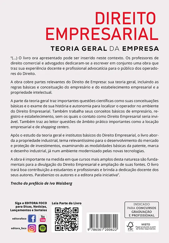 A obra é importante na medida em que cursos mais amplos desta natureza são fundamentais para a divulgação do Direito Empresarial e ampliação de suas fontes. O livro trará boa contribuição a estudantes e profissionais e brinda a dedicação docente dos seus autores. Parabenizo os autores e a editora pela iniciativa”.
