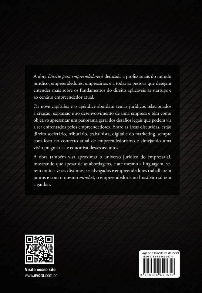 Obra dedicada a profissionais do mundo jurídico, empreendedores, empresários e a todas as pessoas que desejam entender mais sobre os fundamentos do direito aplicáveis às startups, ao cenário empreendedor atual e a todo o tipo de empresa, não importa o porte.