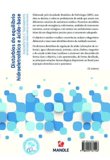 O livro “Distúrbios do Equilíbrio Hidroeletrolítico e Ácido-Base – Diagnóstico e Tratamento da SBN” foi elaborado pela Sociedade Brasileira de Nefrologia (SBN) e é dirigido a todos os profissionais de saúde que atuam nos diferentes cenários de assistência médica. As alterações do estado de hidratação/volemia, dos níveis séricos e urinários de eletrólitos e do estado ácido-base são extremamente comuns na prática clínica. Pacientes atendidos nos serviços de emergência, nas enfermarias, nas unidades de tratamento intensivo, no centro cirúrgico e até mesmo em nível ambulatorial necessitam de diagnóstico preciso para o tratamento adequado. O objetivo da obra é auxiliar o médico a reconhecer, realizar o diagnóstico diferencial e tratar esses distúrbios dentro da realidade nacional.