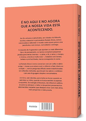 É NO AQUI E NO AGORA QUE A NOSSA VIDA ESTÁ ACONTECENDO. Em Do universo à jabuticaba, um clássico do filósofo, escritor, educador e psicanalista Rubem Alves, somos convocados a saborear o mundo como quem prova uma jabuticaba: com tempo, curiosidade e entrega. Compostos de fragmentos que ajuntam os mais diferentes tipos de pensamento, os textos formam pequenas janelas para temas imensos — a alma, a fé, o amor, o tempo, a música, a morte e muito mais —, tratados com leveza, beleza e profundidade, marca consagrada do autor. Ler Rubem Alves é como conversar com um velho e sábio amigo – desses que sabem ouvir o silêncio e falar direto ao coração –, e, a cada página, vemos perguntas difíceis serem transformadas em reflexões delicadas, que lançam luz sobre o cotidiano com uma linguagem simples e encantadora. Um livro, sem dúvidas, para todas as horas: quando se está feliz ou triste, quando se busca sentido ou apenas companhia. Da teologia à literatura, da infância à velhice, as palavras abraçam o leitor e despertam pensamentos adormecidos naqueles que desejam viver com mais alma, mais perguntas e mais poesia.