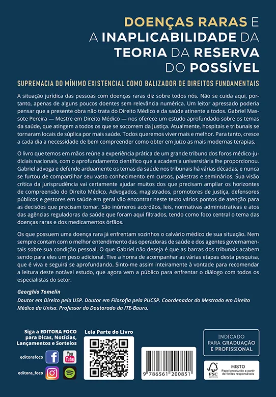 A situação jurídica das pessoas com doenças raras diz sobre todos nós. Não se cuida aqui, portanto, apenas de alguns poucos doentes sem relevância numérica. Um leitor apressado poderia pensar que a presente obra não trata do direito médico e da saúde atinente a todos. Gabriel Massote Pereira – Mestre em Direito Médico – nos oferece um estudo aprofundado sobre os temas da saúde, que atingem a todos os que se socorrem da Justiça. Atualmente, hospitais e tribunais se tornaram locais de súplica por mais saúde. Todos queremos viver mais e melhor. Para tanto, cresce a cada dia a necessidade de bem compreender como obter em juízo as mais modernas terapias.