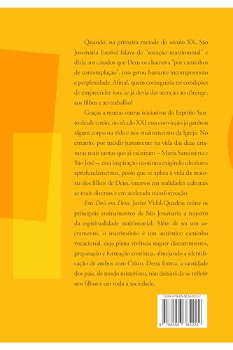 Em Dois em Deus, Javier Vidal-Quadras reúne os principais ensinamentos de São Josemaria a respeito da espiritualidade matrimonial. Além de ser um sacramento, o matrimônio é um autêntico caminho vocacional, cuja plena vivência requer discernimento, preparação e formação contínua, almejando a identificação de ambos com Cristo. Dessa forma, a santidade dos pais, de modo misterioso, não deixará de se refletir nos filhos e em toda a sociedade.