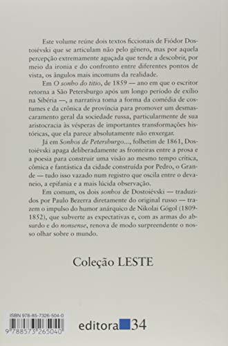 Dois sonhos de Dostoiévski reunidos em um único volume. Em O sonho do titio (1859), a trama se passa na cidadezinha imaginária de Mordássov, onde a chegada de um velho príncipe acaba provocando o desmascaramento da hipócrita sociedade local. Já Sonhos de Petersburgo em verso e prosa (1861) combina os registros da prosa e da poesia para construir uma visão ao mesmo tempo crítica, cômica e fantástica da cidade de São Petersburgo.