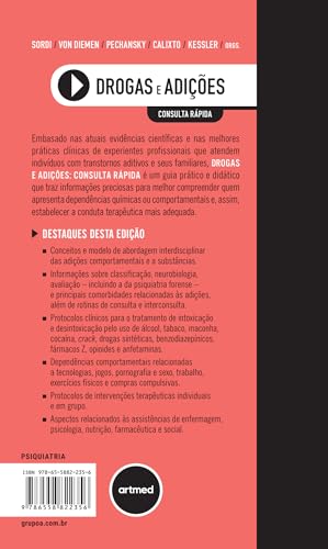 Embasado nas atuais evidências científicas e nas melhores práticas clínicas de experientes profissionais que atendem indivíduos com transtornos aditivos e seus familiares, Drogas e adições: consulta rápida é um guia prático e didático que traz informações preciosas para melhor compreender quem apresentam uma adição – seja ela química ou comportamental – de forma integral e, assim, estabelecer a conduta terapêutica mais adequada.Os destaques deste livro são: conceitos e modelo de abordagem interdisciplinar das adições comportamentais e a substâncias; informações sobre classificação, neurobiologia, avaliação – incluindo a da psiquiatria forense –, principais comorbidades relacionadas à adições, além de rotinas de consulta e interconsulta; protocolos clínicos para o tratamento de intoxicação e desintoxicação pelo uso de álcool, tabaco, maconha, cocaína, crack, drogas sintéticas, benzodiazepínicos, fármacos Z, opioides e anfetaminas; dependências comportamentais relacionadas a tecnologias, jogos, pornografia e sexo, trabalho, exercícios físicos e compras compulsivas; protocolos de intervenções psicoterápicas individuais e em grupo; aspectos relacionados às assistências de enfermagem, psicologia, nutrição, farmacêutica e social.