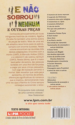 Conhecida principalmente por suas intrigantes histórias de mistério, Agatha Christie foi também uma exímia autora de peças de teatro. Mais de uma vez ela adaptou seus livros para os palcos, sempre com enorme sucesso. Neste volume encontram-se reunidas três destas adaptações: Encontro com a morte (1945), A Mansão Hollow (1951) e a célebre E não sobrou nenhum (1943). Nesta última, que é o maior best-seller da autora, dez pessoas isoladas em uma ilha são forçadas a pagar por seus crimes passados, num jogo de expiação perverso e mortal. Vale ressaltar que cada peça apresenta, em termos de enredo, diferenças significativas do romance que a inspirou, demonstrando mais uma vez que a Rainha do Crime sempre consegue surpreender o leitor.
