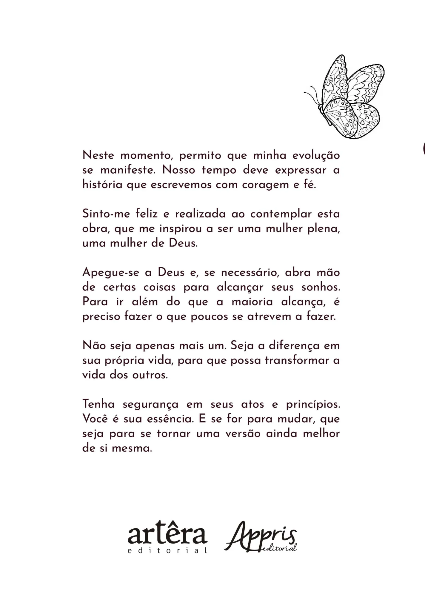 Neste momento, permito que minha evolução se manifeste. Nosso tempo deve expressar a história que escrevemos com coragem e fé. Sinto-me feliz e realizada ao contemplar esta obra, que me inspirou a ser uma mulher plena, uma mulher de Deus. Apegue-se a Deus e, se necessário, abra mão de certas coisas para alcançar seus sonhos. Para ir além do que a maioria alcança, é preciso fazer o que poucos se atrevem a fazer. Não seja apenas mais um. Seja a diferença em sua própria vida, para que possa transformar a vida dos outros. Tenha segurança em seus atos e princípios. Você é sua essência. E se for para mudar, que seja para se tornar uma versão ainda melhor de si mesma.